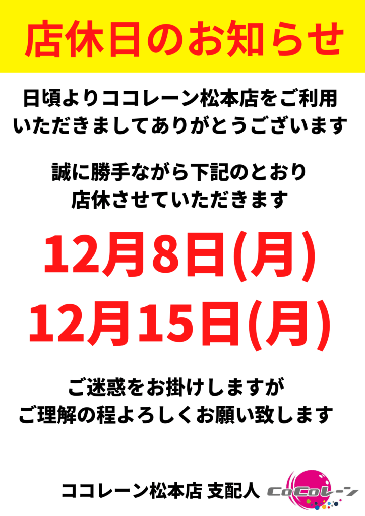 店休日制定のお知らせ
