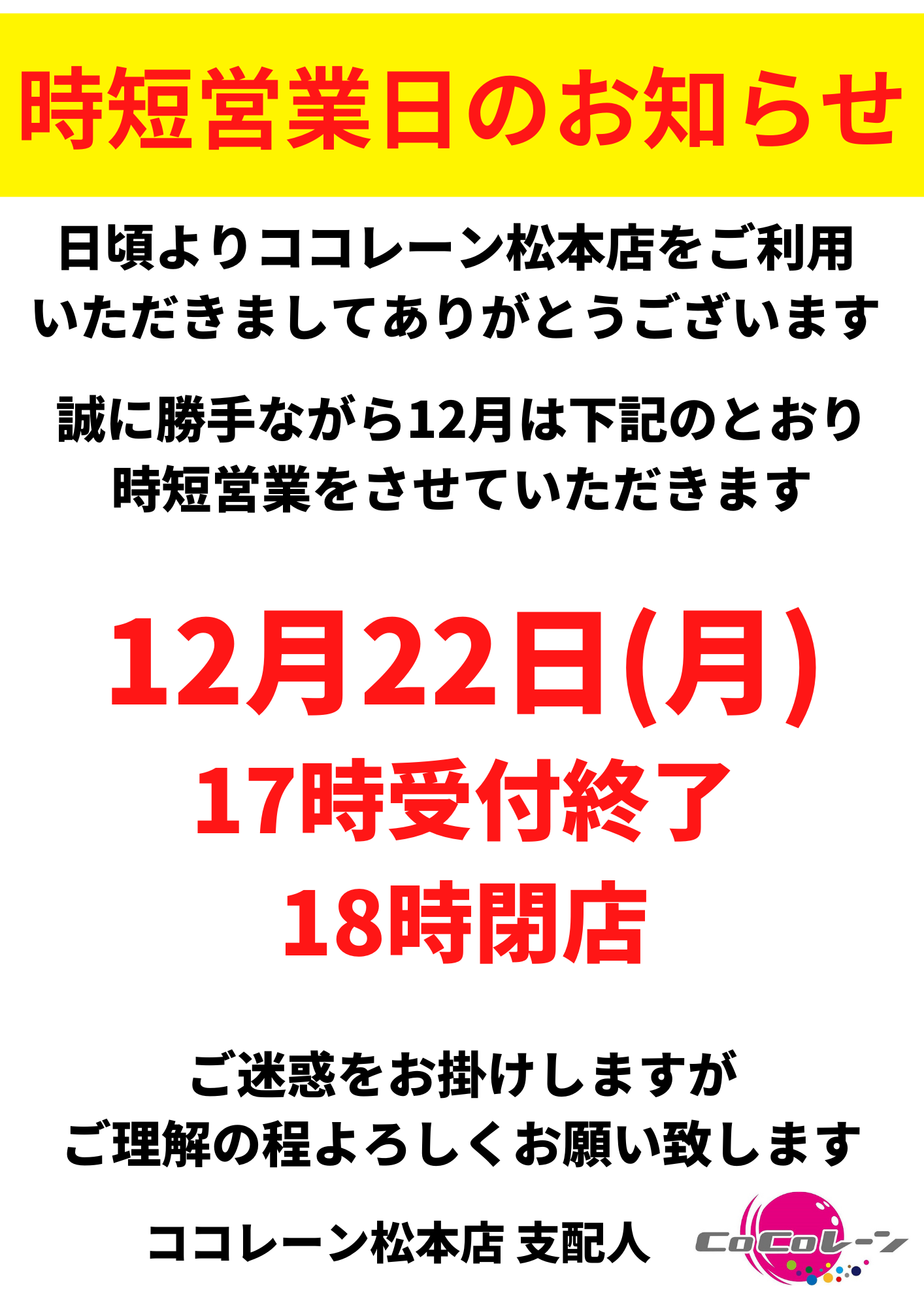 2025年12月の店休日と時短営業日のお知らせ