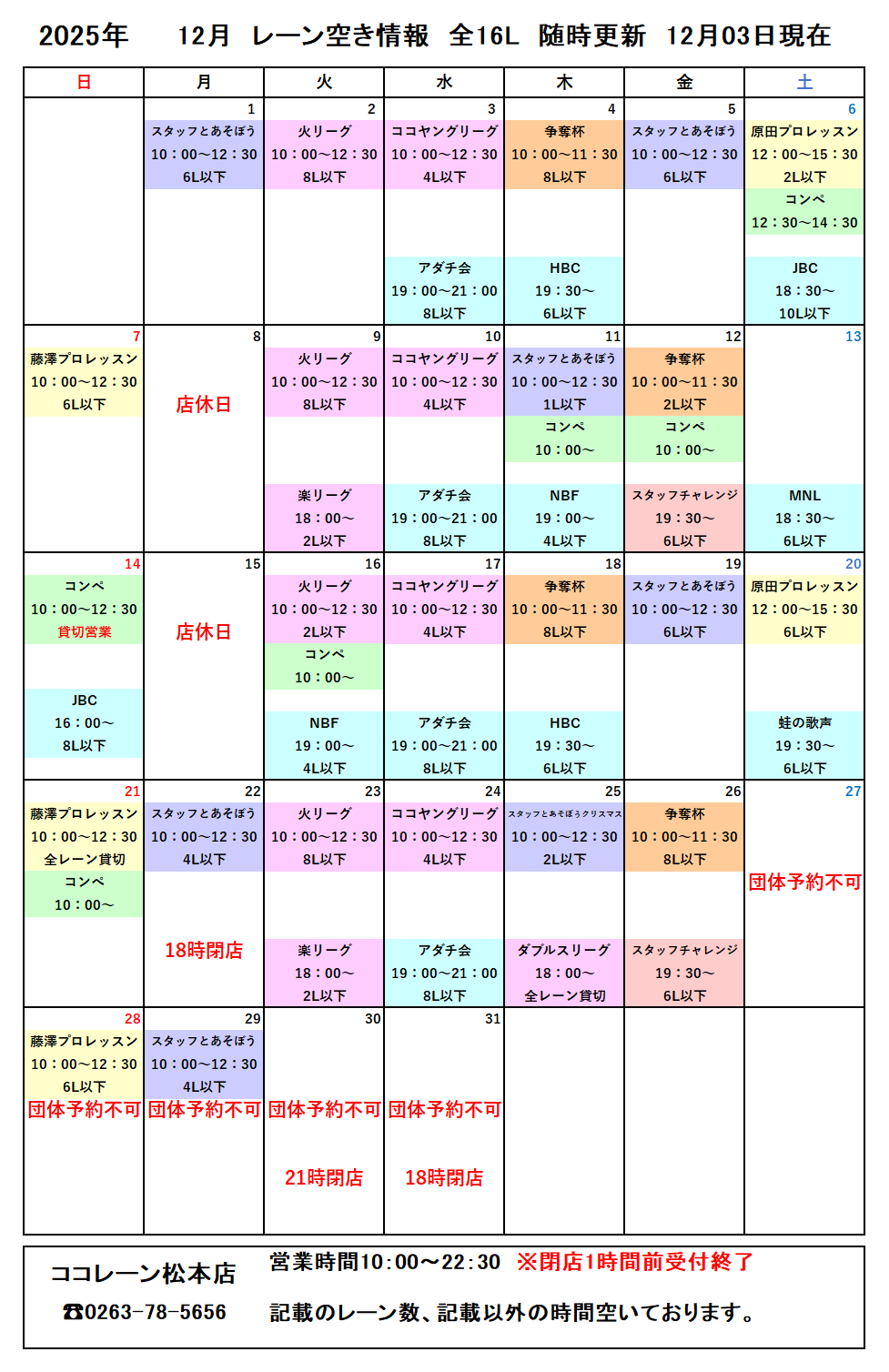 レーン空き情報12月
