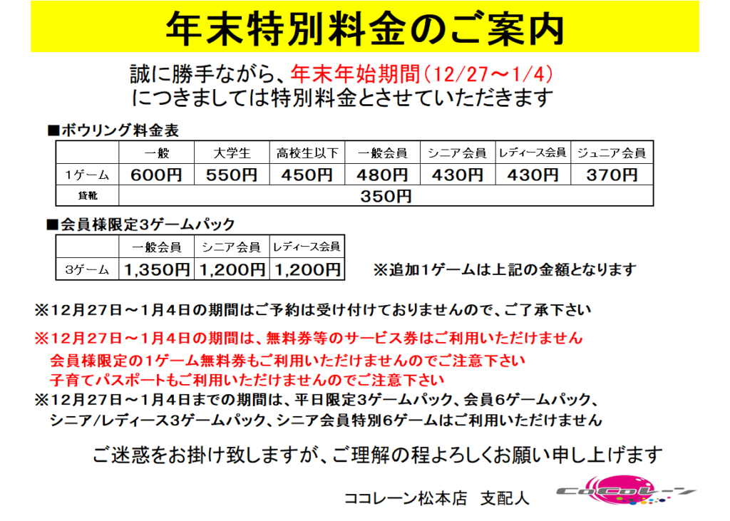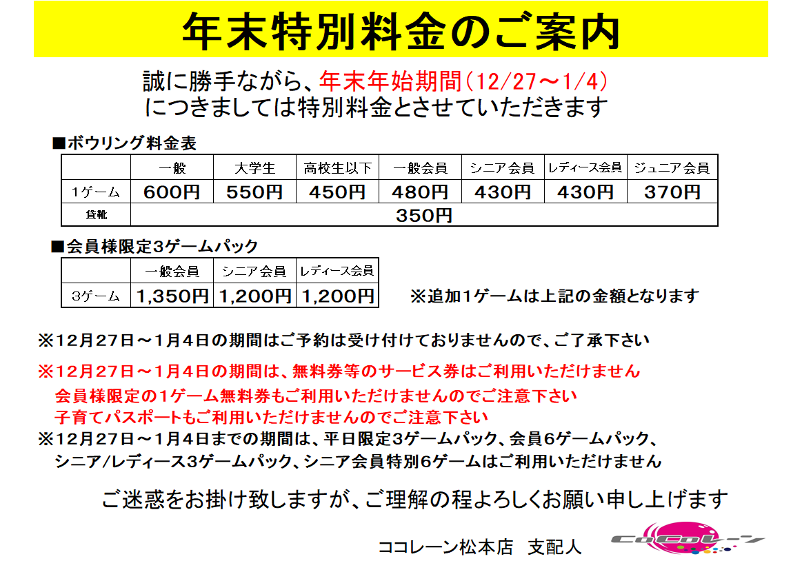 年末年始料金のご案内
