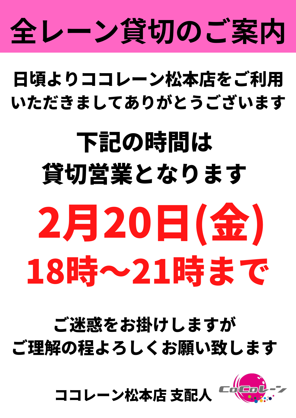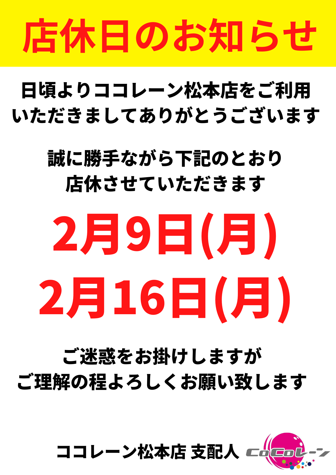2月の店休日と貸切営業のお知らせ